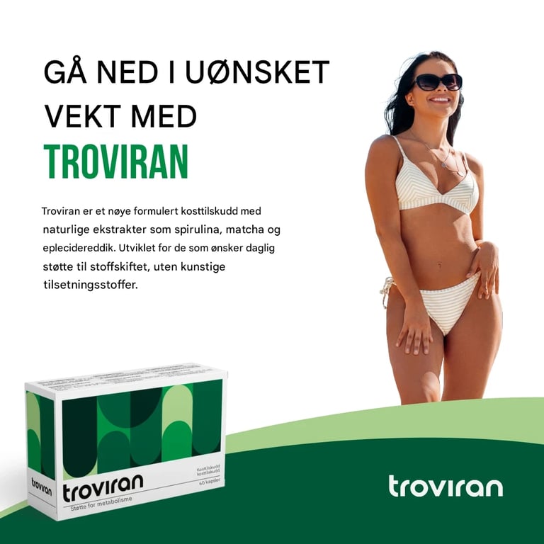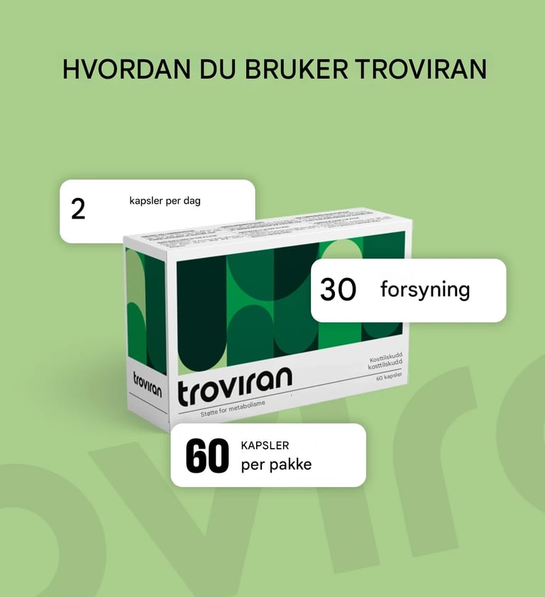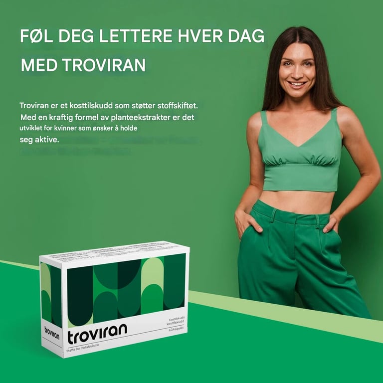 Troviran Norge er et kosttilskudd i kapselform spesielt utviklet for å støtte vekttap, og er tilgjengelig eksklusivt på nett. Ifølge produsenten er formelen basert på en utvalgt kombinasjon av naturlige stoffer av høy kvalitet som er utformet for å stimulere stoffskiftet og intensivere fettforbrenningen – og dermed mobilisere selv gjenstridige fettavleiringer mer spesifikt.